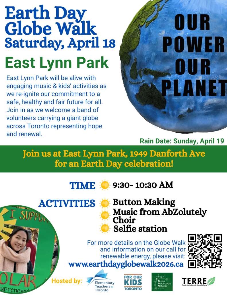 On Saturday April 18, Artists for Real Climate Action and other climate groups will be walking a giant globe across the city to demand climate action from the province. The globe will be stopping at various celebratory events, called Re-Charging Stations, at parks along the way for performances, children’s activities, and petition signing. TERRE is hosting the Re-Charging Station at East Lynn Park on Sat. April 18 from 9:30-10:30. Come and join us at East Lynn Park or another park! You can also sign up to walk with the globe for part of the day; see details on the website.